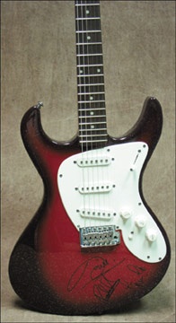 A Dan Electro glitter body (reissue) electric guitar signed in person in NYC while promoting their new LP and TV special.