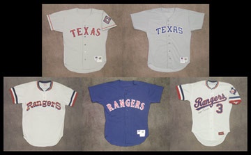 Several styles of gamers from the Lone Star State. 1) 1996 road grey. 2) 1984 home white. 3) 1980's home white. 4) 1992 road grey. 5) 1995 batting practice jersey. All show fine use and are completely tagged.