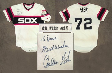 Coveted pull-over style exhibits heaps of use from one of the toughest backstops in the game's history. "Sox" in white blasts from the blue and red bands on the chest, with "Fisk 72" on back. All-Star Game Fiftieth Anniversary patch on left sleeve. Tagging in tail reads, "Designed & Tailored Exclusively for the Chicago White Sox, Medalist Sand-Knit" with "82 Fisk 46T" strip tag. NRMT blue sharpie inscription below on right chest reads, "To Dave, Best Wishes, Carlton Fisk."
