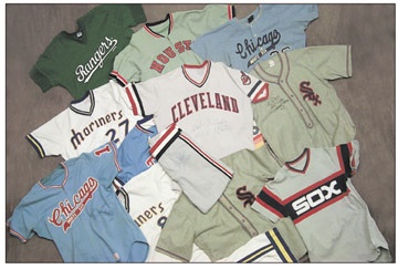 Straight from the diamonds of Major League parks. 1) 1981 Texas Rangers, all original. 2) 1980's Houston Astros, name plate change. 3 & 4) Two 1977 Seattle Mariners, removed name on each. Also included is one pair of matching pants. 5) 1982 Chicago White Sox, all original. 6) 1975 Chicago White Sox, all original and signed by Bill Melton. 7) Chicago White Sox Minnie Minoso Old Timers' Game jersey, signed. 8) Chicago White Sox Old Timers' Game jersey. 9) 1972 Houston Astros, number change, zipper broken. 10) 1967 Chicago White Sox, number restored. 11) 1979 Cleveland Indians jersey and pants with name and number change to become Bob Feller's Old Timer's Game uniform. Each is signed by Feller in NRMT blue sharpie. 12) 1990's Texas Rangers St. Patrick's Day green mesh, all original.