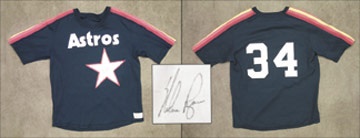 It was a world class arm that once filled the right sleeve of this navy pullover, one responsible for a strike out total that borders on the ridiculous. "Astros" and lone star (in which Ryan has penned a NRMT black sharpie signature) on front, with number "34" on back. Good use. Tail tagging: "Designed and Tailored Exclusively for the Houston Astros Medalist Sand-Knit." Reserve $400. cat: jerseysL8880 Derek Jeter Signed Jersey. Limited edition (202/500) 1999 replica jersey from Steiner Sports has the DiMaggio memorial number "5" and black band on left sleeve. Blue sharpie signature from the star shortstop is perfect. All authenticating materials included.