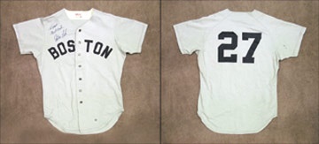The Fenway Park hero's last season with the Sox. He wore this one on the road though, putting fine catcher's use on this grey gamer. "Boston" arcs across chest, with number "27" on verso. "Wilson [size] 44" tagging in collar and "80" year tag in tail. To round out a perfect package, we've also got a NRMT blue sharpie inscription, "To Dave, Best Wishes, Carlton Fisk," on the chest.