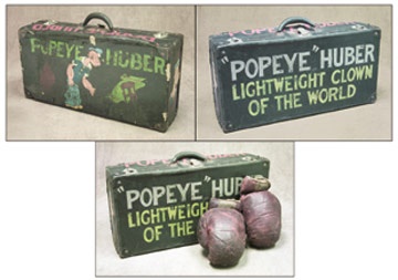 Wonderful complete setup of the Baltimore area boxing clown known as John "Popeye" Huber. A serious fighter, he also clowned in the ring and looked and dressed like the comic character Popeye. Trunk has handpainted folk art images of Popeye on the sides and back. Front reads, "Popeye Huber Lightweight Clown of the World." Inside is his fight worn Spalding gloves from the 1930's. There is also a great deal of personal effects: photos, vaudeville tintypes, business card, real photo boxing postcard, boxing promo, boxing letters, & newspaper articles (one showing this very trunk). 11x7x23". Trunk is overall VG with some wear to the front paint.