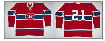 Magnifique! The bleu, blanc et rouge of the Montreal Canadiens in an early 1970's tie-neck style.  This durable Dureen jersey shows loads of washing although a few marks remain as evidence of game usage.  Sleeve numbers are cut in a two-season style, worn from 1972-74.  Tagged by Wilson with "48" in ballpoint. Custom garter fight strap added, typical of Habs gamers of the period.  During the 1972-73 season, number "21" was shared by Randy Rota, Dave Gardner and Yvon Lambert.