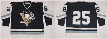A penguin in full stride glides across the chest of this blue and white Pittsburgh uniform from 1977. Sought after style in heavy mesh with five or six team repairs. Crest and two-tone number "25" stitched on. Tagged in the collar by Stall & Dean with washing instructions above two fly tags, one with "52" and the other "7", denoting the year. A few remaining threads point to the removal of a name or plate. Great wear inside and out!