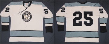 Striking early Seventies-era white Dureen uniform of the Pittsburgh Penguins worn by Darryl Edestrand. Most attractive is the embroidered circular defunct design skating penguin crest on the chest. Edestrand was a regular with the Pens from 1971 through 1974, this shirt was worn towards the beginning of that period. Tagged in the collar by Wilson with the blank area for the size (early '70's style), original lace in neck. NNOB, everything sewn on. A few good marks, burns and stains with a number of light runs in the Dureen. Heavy pilling inside above the elbows. Team repairs on the back from the removal of a nameplate. An impossible style that will continue to increase in value in the coming years.