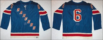 Battle weary blue Dureen from the glory days on Broadway. Glen Sather's number "6" sits on the back and sleeves of this hammered road Rangers uniform. Frayed Cosby tag in the hem, size and year tags missing. Covered in repairs, especially on the sleeves. Ribbed shoulders with a lace-up neck. Drop shadow numbers and letters stitched on. No evidence of a name on back, probably worn during the 1970-71 season. A beaten example from this Hall-of-Fame Rangers GM.