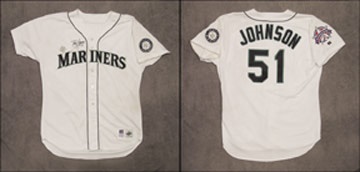 His numbers this season left nobody surprised when he won the A.L. Cy Young in a landslide-eighteen wins and only two losses (!), 294 K's, and an ERA under two and a half. Cooperstown will come calling for this one soon enough, but for now it's up for grabs. "Mariners" on chest, with "Johnson 51" on back. "All-Star Game" patch decorates right sleeve, with team logo patch on the left. Tail tagging is "Russell Athletic Diamond Collection [size] 50" with "100% polyester" and unsurprising "3" Extra Length" flag tags. "95" year tag as well. Really nice use-he obviously racked up quite a few of those numbers in this one. Black sharpie signature is NRMT. LOA from Major League Baseball.
