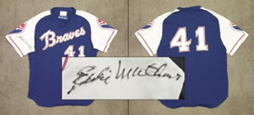 The recently departed 500 Home Run Clubster and HOF'er wore this great blue and white pullover on the road as he managed fellow long baller Hank Aaron. "Braves 41" on front; "41" on back. Tagging in collar is "Sand Knit [size] 44" with "44-73-Set 1" stitched below. Good use. Black sharpie signature is NRMT on right sleeve. A real find.