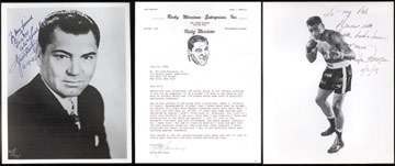 More punch for your buck with this selection of perfectly inked pugilistic photos and paper. 1) 1959 Floyd Patterson inscribed 8x10" photograph. 2) 1961 Jack Dempsey inscribed 8x10" photograph. 3) 1966 Rocky Marciano signed letter. Great content regarding a hypothetical match with Ingemar Johansson. On "Rocky Marciano Enterprises" letterhead.