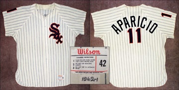 The Hall of Famer's seventh year in the Majors, and his seventh consecutive season atop the stolen base leader board. The little Venezuelan's home white pinstriped gamer shows fine use, though it was sent down to the Minors after Luis was done with it. As a result, the name is not original, though the "Sox" on the chest and the tail tagging, "Wilson [size] 42, 1962-1" are untouched. Collar tag removed. Still a fine looking garment, with exceptional display value.