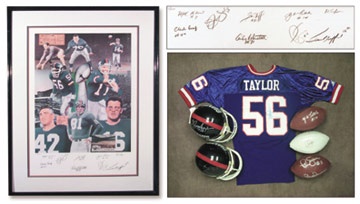 Big Blue's finest straight out of the Meadowlands 1) Taylor signed pro helmet. 2) Taylor signed blue jersey. 3) Tittle signed replica helmet. 4) Simms signed white panel ball. 5) Simms/Parcells signed real ball. 6) Tittle signed real ball. 7) Giants greats signed lithograph. All signatures perfect except for Taylor jersey (7/10) and Simms/Parcells ball (8/10).