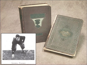 The Iron Horse was instantly beloved by the New York city baseball world for being a hometown boy, straight from the diamond and gridiron of Columbia University. He is pictured in each of these leather bound volumes of The Columbian, published shortly before he made the move to the Bronx. Each has wear at the binding, with the latter volume's cover coming unattached. Otherwise all interior pages are in terrific condition.