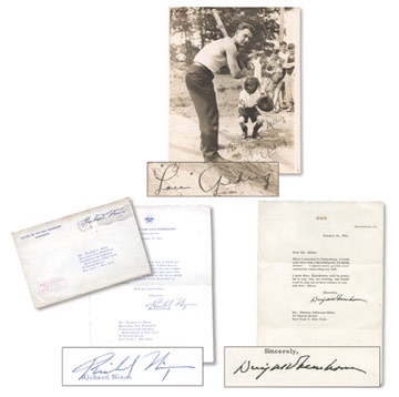 One of the most charming Gehrig photos we've ever seen, and signed to boot! Strong 9/10 inscription reads, "To Thomas Miley from 'Lou' Gehrig." If you're wondering who Thomas Miley is, look to the freckle-faced kid struggling under the weight of a huge catcher's mask and mitt. That's him. His friends watch from the background, giving this a great sandlot, "Our Gang" sort of feel. By way of authentication we offer a couple of other intriguing pieces. First is a letter in its original envelope from Vice President Richard Nixon mailed in 1954, thanking Mr. Miley for an earlier letter. The two Nixon signatures are autopen. The later (1961) letter from Dwight Eisenhower, however, is signed in perfect black ink by Ike himself. That signature is as strong as Gehrig's. All pieces were acquired from Mr. Miley personally. An unusual lot to be sure, but who's complaining?