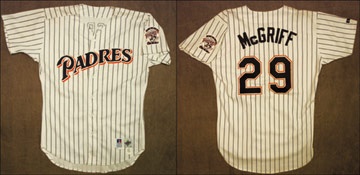 Only half a season in San Diego this year, but it must have been a tough one. Is that staining blood or just dirt? Home white pinstriped gamer has "Padres" across chest, with "McGriff 29" on back. Twenty-fifth anniversary patch on left sleeve. Tagging in tail is from "Russell Athletic Diamond Collection [size] 44" with a "100% polyester" and "2" Extra Body Length" flag tags.