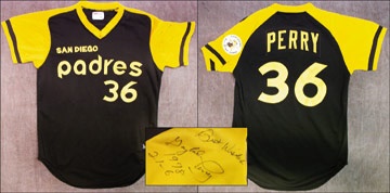 His twenty-one and six record this season earned him his second Cy Young award and gave him the unique distinction of being the only man to win one in each league. Jersey shows fantastic wear, with "San Diego Padres 36" across chest and "Perry 36" on back. All-Star patch on left sleeve. Collar tagging is "Wilson [size] 46" and tail has "36 78" chain stitched in white. Left sleeve is signed in black sharpie, "Best Wishes, Gaylord Perry, 1978, 21-6." LOA from Perry is included.