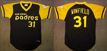 The new Hall of Famer's second All-Star season, and the first with a .300-plus batting average. Classic and coveted pull-over style is ready for Cooperstown, with groovy "San Diego Padres 31" covering chest and "Winfield 31" on back. All-Star patch on left sleeve. Collar tagging is "Wilson [size] 44" and tail has "31 78" chain stitched in white. Good use. Reserve