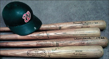 From the collection of a 1960's Washington Senators bat boy comes this vintage assortment. Bats are as follows: 1) Paul Casanovo signature model H&B. Signed. 2) Jimmie Hall signature model H&B. Marked "Minnesota Twins - '66." 3) Dan Blasingame Adirondack. Signed. 4) Chuck Hinton signature model H&B. Marked "Clevand - 1966." All show strong use. Helmet is a Washington Senators gamer, with number "3" on visor.