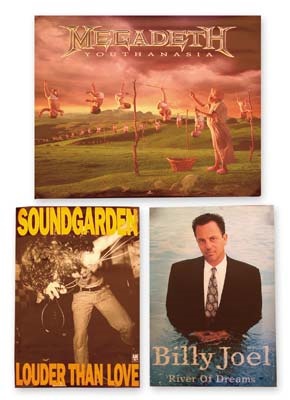 This mega selection is a dealer's dream of one hun-dred different rolled posters for your wall. If one falls off you'll have ninety-nine! Dating from the 1970's through the 90's this very interesting and versatile mix ranges from VG to NRMT. It includes such clas-sics as Cream Farewell, Led Zeppelin Coda, Peter Gabriel Shock The Monkey, Rolling Stones' American Tour '72, Lou Reed, David Bowie, Soundgarden, Duran Duran and many, many more. Artists represented are the Beatles, Police, Cure, Hall & Oates, Foreigner, Blondie, AC-DC, Jimi Hendrix, Cheap Trick, Eagles, Iggy Pop, John Cougar, Cars, Prince, and more good stuff. No dogs!