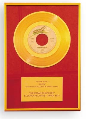 This Japanese Gold Record Single Award was presented to Queen in 1975 for one million dollars in single sales and features the unique red velvet background. NRMT.