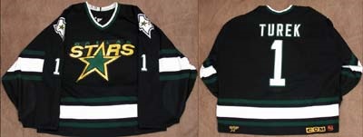 Roman Turek has dazzled over the past few seasons earning him more than his share of starts in the game's premier league. Massive black goalie cut uniform with Roman's number "1" on the back and sleeves. Manufactured by CCM in size 60 with widened sleeves and custom cut cuffs. NHL, CCM and Stars logos embroidered onto back hem with 97-98 marked in black in the collar. Decent wear for a goalie shirt with pilling in the chin area. Extensive package of documentation including LOA from the Dallas Stars.