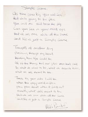 From Michael Pinder, these lyrics, tasteful matted and framed, are for "Simple Game." Michael was the orig-inal keyboardist of one of the U.K.'s best-loved bands. The composer signed the bottom as well. A treasured piece for the Moody Blues devotee.