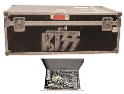 A drummer's dream come true, this is a virtual treasure chest of drum hardware with early KISS stencil on front used by Peter Criss. Goodies include-hundreds of items like cymbal stands, rims for toms and snares, drum sticks and pedals. Estimate $500-$750.