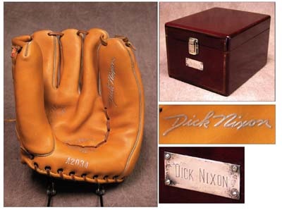 Absolute one-of-a-kind specimen will cause a feeding frenzy between political and glove collectors, as well as drawing in any-body who likes a unique piece. This pristine "Wilson" glove was manufactured for then-Senator Nixon, who went by the name "Dick" rather than "Richard," as the stamping on the glove would indicate. Use is not visible, as the future prez only wore it for a few moments while throwing out the first pitch at a ball game. It was then returned to its custom walnut box, affixed with a simple plaque on the front reading, "Dick Nixon." The box, too, is NRMT.