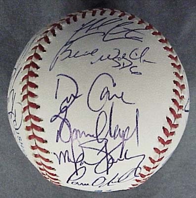 The great dynasty begins! OAL (Budig) ball supplies twen-ty- four flawless blue ink sig's from guys like Jeter, Boggs, Torre, Cone, Martinez, Rivera, O'Neill and Williams. A huge-ly important squad.
