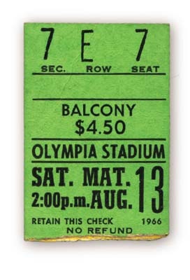 A return trip to Detroit's Olympia Stadium for a pair of performances. A stub from the afternoon gig where 14,000 were in attendance. EX.