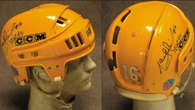A rare piece of game gear from a monster goal-scorer. Eighties-vintage yellow CCM lid with "16" in white decals on the back. Two large cracks on the right side took this one out of action. All original with interior pads intact. Dionne has added a bold black signature with "HOF 92". From the collection of former Bruins equipment man Frosty Forristall.