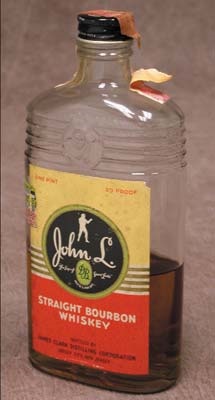 There's still a few good slugs left of this nine-ty- proof straight bourbon whiskey, produced shortly after the bare-knuckle Champ's reign. You occasionally see the collectible pourer, but almost never do you see the bottle, espe-cially with some product left over. Label is very strong, EX+ conservatively. Remember that John L. used to slug whiskey after every round to dull the pain, so you may want to use this the next time you get in a scrap.