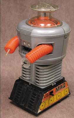 Peligro! Peligro! Warning! Warning! -- or the equivalent in Spanish. This toy battery operated robot is the Spanish version of the much loved television robot. He is very rare and has stick-ers on his base that read "Maq El Robot Parla