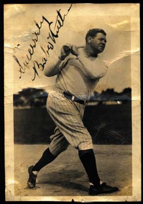 This famed 3.5x5" image of his 1930's spring training is signed in the classic and most desired "1940's" sig-nature style, "Sincerely Babe Ruth." There is some wear and tear on the photo not affecting the signature, which is in quite dark, and thick fountain pen ink. It is in overall good condition and was obtained from a Massachusetts man whose father had obtained it in person over 50 years ago.