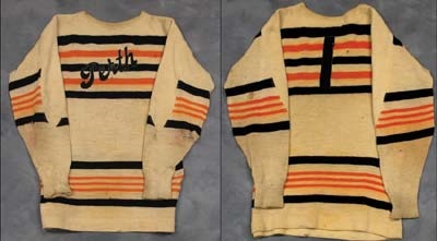 Vintage cream colored wool uniform with black and orange accenting and "Perth" in ancient double-layered felt script crossing the chest. Felt number "1" stitched on the back shows this one was worn by an early netminder. The town of Perth, Ontario boasted a number of successful semi-pro teams during the period, in both men's and women's leagues. In excellent condition with a few stitched repairs and a number of small unrepaired holes (quite common on these old wools). An attractive and historic specimen.