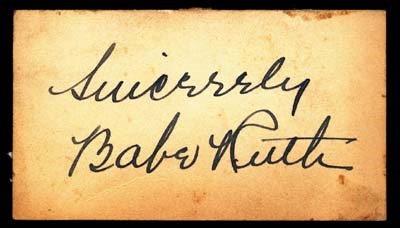 Find your favorite Ruth photo (perhaps in this auction), because this will look just amazing matted beneath it! Blank business card has 10/10 ink, reading, "Sincerely, Babe Ruth." Card is lightly toned, but looks terrific.