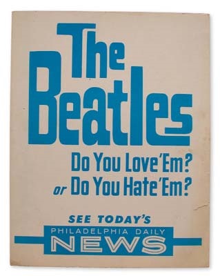 This cardboard outdoor newsstand advertising poster was used during the Fab Four's visit to the "Town of Brotherly Love." NRMT.