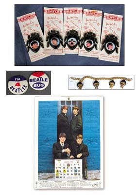 You get a 1964 11x14" calendar with bottom that tells you how to reach the Beatles; a set of five Beatles bug brooches on cards (reproductions); a set of nine tin gum machine buttons; plus a Beatles head charm bracelet on a gener-ic display card.
