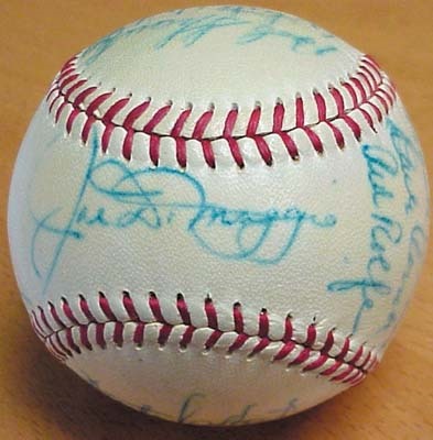 Pinstripe power to spare here, with a big sweet spot sig from DiMaggio, and Home Run Baker, Combs, Gomez and Henrich nearby. Fifteen sig's total on an OAL (Harridge) ball. EX-MT.