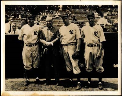 Colonel Ruppert poses with the toasts of New York City's Little Italy. Lazzeri, DiMaggio and Crosetti look sharp in pin-stripes. EX. (8x10")