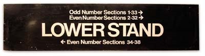 Fabulous sign came from the original demolition of Yankee Stadium in 1972-73. This was saved by the demo compa-ny and later sold to J. Peterman (of Seinfeld fame) who we obtained this directly from. Measuring 96" long it identifies you as being in the Lower Stand and directs you to your seat area. Cast metal with stark b/w colors. An amazing piece of stadium history. Yankee Stadium stuff from the original era is next to impossible to find.