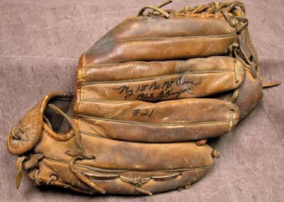 For the first eighteen years of the New York Mets' existence, one man held down first base duties at Shea. The man was fan favorite Ed Kranepool, and this is the glove that he wore as an eighteen-year old kid during that tumultuous first season. His authenticating inscription finds a home on the outside of the middle finger in perfect black sharpie: "My 1st Pro Met Glove, 1962, Ed Kranepool, #21." The "Spalding Whitey Ford Pro Model" glove shows splendid use, and must certainly have been used for more than a single season. The faded vintage number "21" in marker on the back is not tough to find. But a better Mets collectible definitely is.