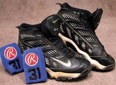 Size ten Nike Air gamers are each marked number "31" on the heel and show terrific, gritty use from behind the plate at Shea. No doubt that these saw a ton of action. And if that's not enough for you, we've also got a pair of Rawlings number "31" embroidered wrist bands. Light use.
