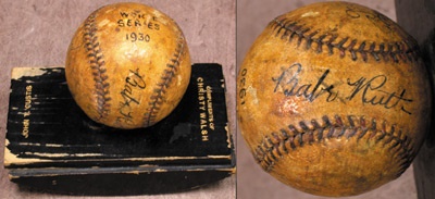Signed in the stands where both Hall of Famers were spectators. Well-toned sphere has a super-dark Ruth sig-nature on the sweet spot, and huge McGraw on the side panel that is only slightly less bold. Three other signatures include famed manager Connie Mack. Ball is notated "World Series 1930" on top, and affixed to a blotter embossed with the recipient's name and "Compliments of Christy Walsh." Walsh, of course, was the Babe's manag-er. For those wanting a very, very strong Ruth signature on a baseball, but concerned about the astronomical cost, this is a perfect solution.