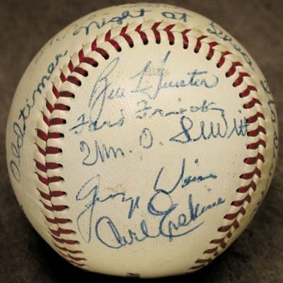 NRMT signatures from Ford Frick, Carl Erskine, Ralph Kiner, Mrs. Lou Gehrig and four more decorate this "Major League" baseball. Notated "Oldtimer Night at Shea Stadium, July 27, 1968" on the sweet spot.