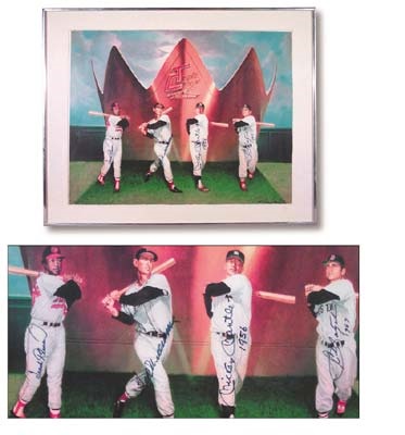 The four men pictured in this wonderful work by Ron Lewis achieved the ultimate in baseball domi-nation. Work towards achieving the ultimate baseball collection with this poster signed by Robinson, Williams, Mantle and Yaz. The Mick and Yaz have even dated their sig's with the year of glory. Signed by the artist as well.
