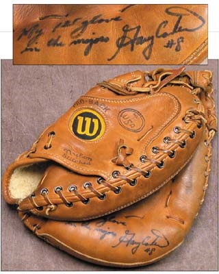 Wilson catcher's mitt came directly from Gary Carter himself. On back on glove is his nicely faded "8" in vintage black marker with matching "Carter" running from top to bottom. The heel of the glove is signed "My first glove in the majors Gary carter #8" in mint black sharpie. From his first days with the Expos of Montreal. Great use and no better authenticity than GC himself.