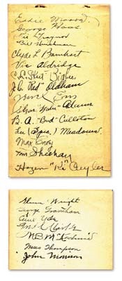 This fascinating 1890 A.J. Reach "Harry Wright" Official Scorebook #8 contains about thirty-five deftly pencil scored Senators games were marked by a Washington area sportswriter from 1925- 27. The book includes three versus the 1927 Yankees with Ruth & Gehrig and three games of the 1925 World Series. In the back, a 7x4" page is beautifully ink signed on two sides by twenty-two mem-bers of the World Champion Pirates: Pie Traynor, Hazen "Ki" Cuyler, Max Carey, Fred Clarke, Bill McKechnie, Morrison, Thompson, Moore, Haas, Barnhart, Aldridge, Bigbee, Oldham, Ens, Huichman, Adams, Culloton, Meadows, Sheehan, Yde, Wright, Grantham. Book is EX-MT, signatures are NRMT, and binding is slightly loose.