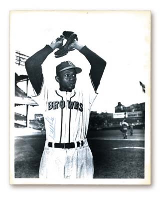 Fine black and white photo of the sto-ried pitcher is signed by him in EX-MT blue ink. A tough signed photo, and an important one. (8x10")