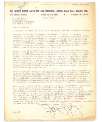 Single page from President John Joy on "The Negro Major American and National League Base Ball Teams, Inc." letterhead is to a NYC sportswriter. Content is spectacular. "aNegro baseball must be properly organized, if it is to surviveaWe know some of our Negro players are being hired by the white majors, that is fine, if they can get these players at their prices or nothing, we may say, since they did not have to pay but a small price for these play-ersa" Page and closing signature are very strong. A piece of exceptional his-torical importance.